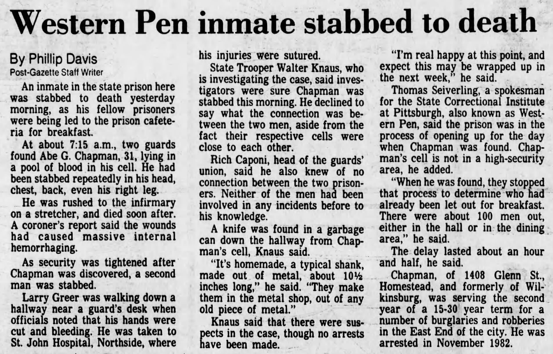 Chapman, who lived in Homestead, was serving the second year of a 15-30 year sentence for a series of burglaries and robberies across the eastern neighborhoods of Pittsburgh.